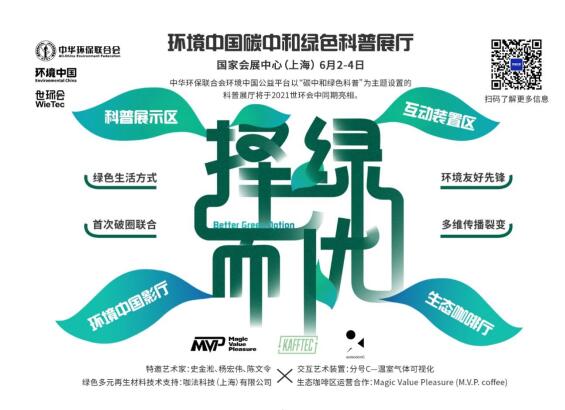 中华环保联合会环境中国公益平台以“碳中和绿色科普”为主题设置的科普展厅将于2021世环会中同期亮相,该展厅由科普展示区、互动装置区、环境中国影厅、生态咖啡厅组成。将邀请艺术名家史金淞、杨宏伟等展出为此次展厅特别呈现的作品,也有青年新媒体艺术团队“分号C”首次呈现将二氧化碳排放数据可视化的交互艺术装置,观众们还能从展厅易读易懂的文字图表呈现方式中详尽地感受“碳中和”跟每个人的密切联系,观察“碳中和”带来的行业巨变,理解“碳中和”的内涵意义和历史价值;生态咖啡厅将绿色低碳的消费方式体现在咖啡厅的一桌一椅,一杯一盏中;搭建也将全面应用绿色多元再生材料,共同倡导大众进行“Better Green Option/择绿而优”的绿色生活方式选择。通过科普展厅的全面展示,参会观众将和“碳中和”重要议题建立联系,认识到在严峻的气候问题面前需要肩负的责任,自发地加入行动中。届时将会邀请多位环境友好引领者和KOL环境先锋达人参展,与多个不同领域媒体共同进行跨界宣传与破圈。
