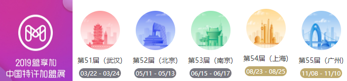 2019年中国特许加盟展在北京、武汉、上海、广州、南京五个城市巡回展出;展出面积超过113000平米,展商数量将超过1600家,专业观众规超过115000人次;其中北京站参展品牌600多个、展出面积接近40000平米。2020年中国特许加盟展将在武汉、北京、南京、上海、广州继续巡展。